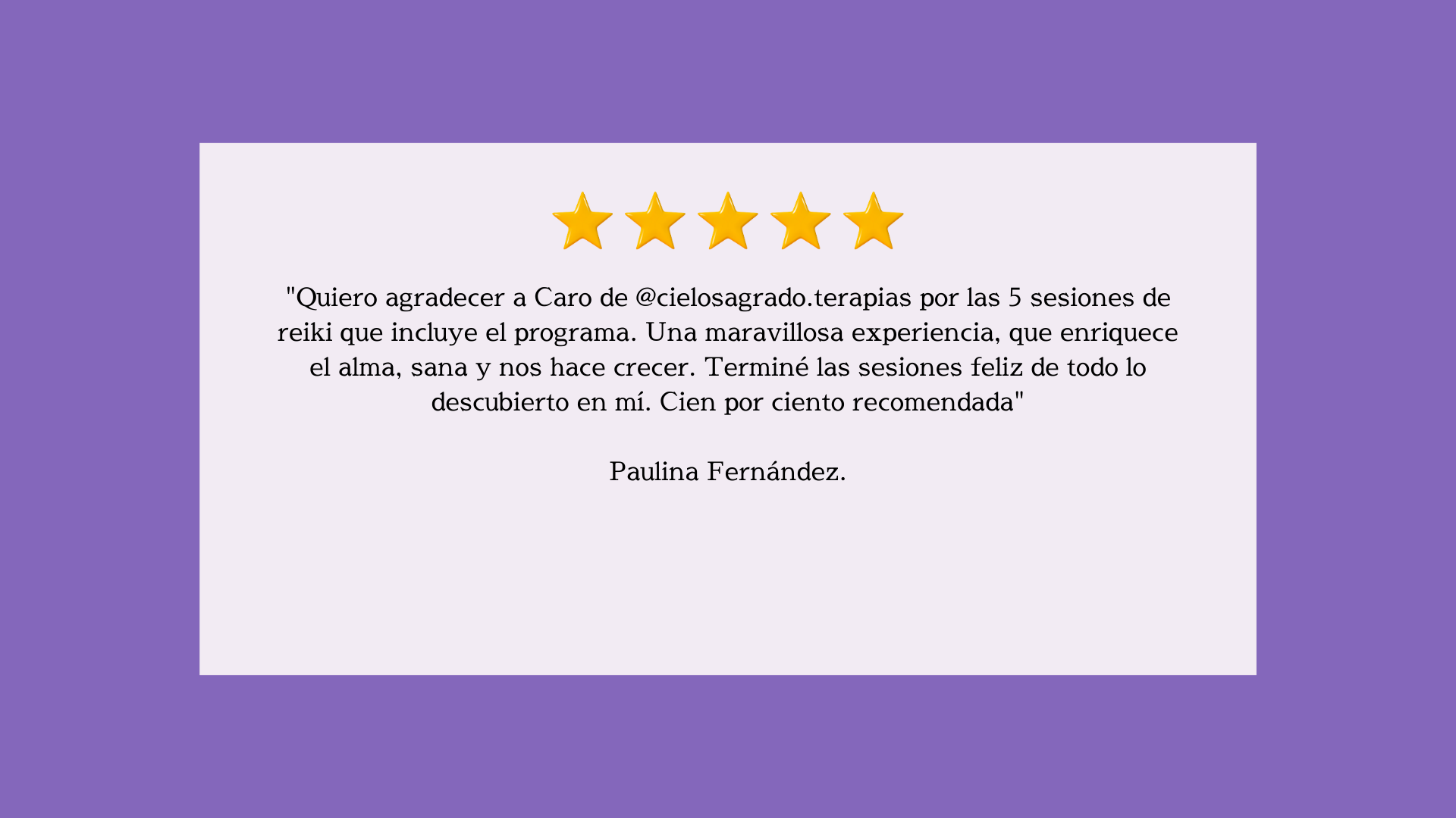 Cuando tomas un ciclo de 5 sesiones Reiki, te permite iniciar un proceso en donde transitas por cada uno de los 5 elementos que conforman tu ser: tierra, agua, fuego, aire y éter. Te regalas 10 horas de trabajo interno profundo que se organizan de la siguiente manera: